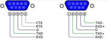 RS422接口的定義很復(fù)雜,一般只使用四個端子,其針腳定義分別為TXD+、TXD-、RXD+、RXD-,其中TXD+和TXD-為一對數(shù)據(jù)發(fā)送端子,RXD+和RXD-為一對數(shù)據(jù)接收端子,參見圖1-4。